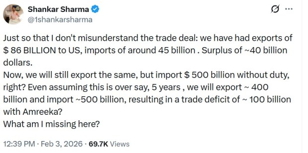 While the government has projected the development as a “win-win”, attention has shifted to a much bigger claim, that India has committed to buying more than $500 billion worth of American goods. The viral skepticism regarding the math was shared by investor Shankar Sharma, who claimed to be “early Amazon, Apple investor” on his X bio.