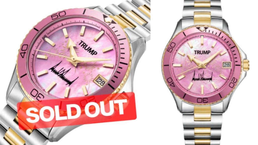 The Trump watch features a bright pink dial and pink bezel with gold tone applied indexes. Boasting its two-tone Bracelet & Case, the website celebrates it “As an exclusive limited edition with only 250 ever made, it’s not just a watch—it’s a unique collectible that celebrates President Trump! The luxurious details and iconic Trump signature make it a standout piece to wear now, while its limited availability creates a treasured keepsake to pass down to your daughter or granddaughter.
