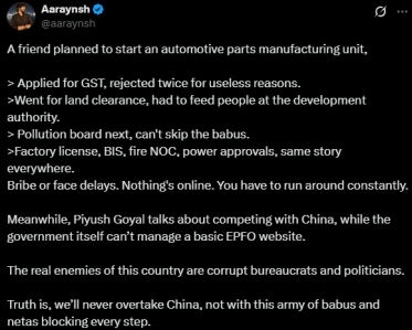 X user Aaraynsh recounted the harrowing experience of his friend’s startup journey, exposing systemic red tape and corruption. “Applied for GST, rejected twice for useless reasons. Went for land clearance, had to feed people at the development authority,” the post read. The user claimed that multiple departments, including the pollution board and licensing authorities, demanded bribes or subjected applicants to unreasonable delays. “Nothing’s online. You have to run around constantly,” he added.