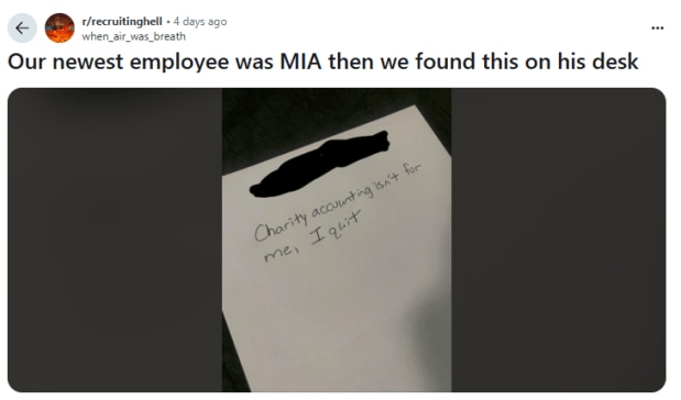 Shared on Reddit, the resignation simply read: “Charity accounting isn’t for me. I quit.” The post, uploaded by a user claiming to be the colleague of the employee in question, included a photo of the handwritten note left behind on the new hire’s desk. “Our newest employee was MIA then we found this on his desk,” the user captioned the post.