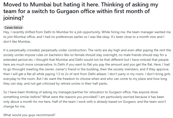 Toward the end of his post, the original user asked if others had ever requested a transfer shortly after joining a new job, curious to know what reasons they gave. Judging by the responses, he’s far from alone in questioning Mumbai’s livability—especially for young, single professionals