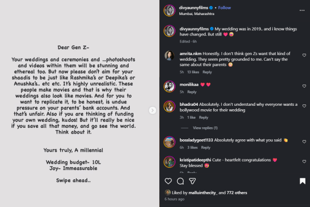 She also said the financial pressure that extravagant weddings can create for families and encouraged couples to think differently about spending. Unny concluded saying, “Wedding budget- 10L Joy- Immeasurable.”