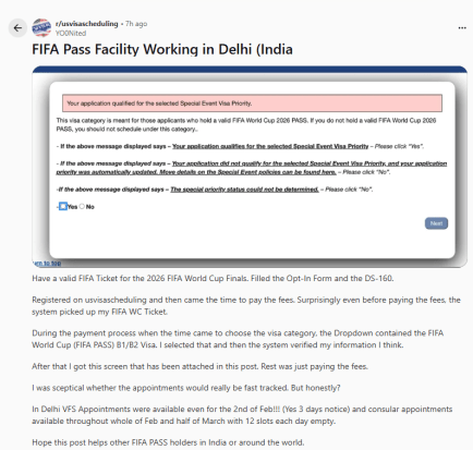 Though unsure at first, the applicant said the fast-tracking was real. In Delhi, biometric appointments were available within just a few days. Visa interview slots were open throughout February and into March, with several slots available each day, something rarely seen by Indian applicants. ” I was sceptical whether the appointments would really be fast tracked. But honestly? In Delhi VFS Appointments were available even for the 2nd of Feb!!! (Yes 3 days notice) and consular appointments available throughout whole of Feb and half of March with 12 slots each day empty. Hope this post helps other FIFA PASS holders in India or around the world,” he wrote on social media.