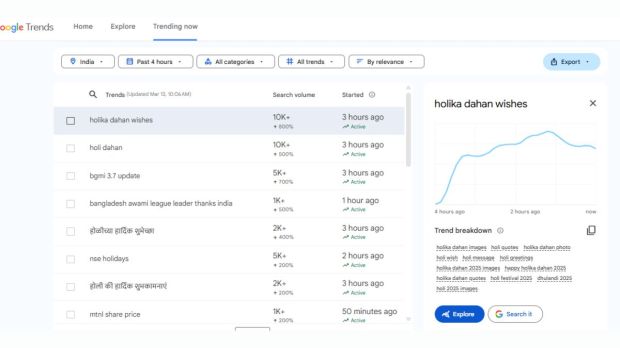 As the festival of colors approaches, Holika Dahan has emerged as a top search query on Google Trends, reflecting the excitement and enthusiasm among devotees. Since Thursday morning, searches related to Holika Dahan have surged, surpassing 20,000 queries. Additionally, wishes and messages for celebrating the occasion have also seen a significant rise.