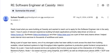 However, this was not the only experience shared by YC companies online. Applying for the same post of “Software Engineer”, Cassidy AI founder and CEO Justin Fineberg shared he, too, received a mail from Soham. Loaded with keywords like “5 years of experience” and “super lean teams”, this email was from August 2024.