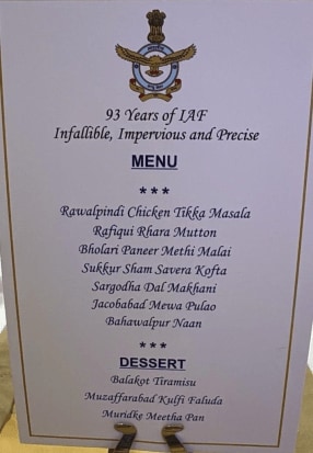 The menu is seen to have seven main course items and three deserts. The main course items included Bahawalpur Naan and Rawalpindi Chicken tikka masala, places which the IAF struck during its operation. On the other hand, Balakot, Muzaffarabad and Muridke were served as desserts.