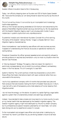 Abhijith Nag Balasubramanya, founder and CEO of Hydro Space Sweden AB, said in a LinkedIn post that he has stepped down from the company and sold the business after being forced to leave Sweden by the end of the month. He described the move as “not an exit by choice” but “an eviction by an incompetent and increasingly hostile state apparatus.”