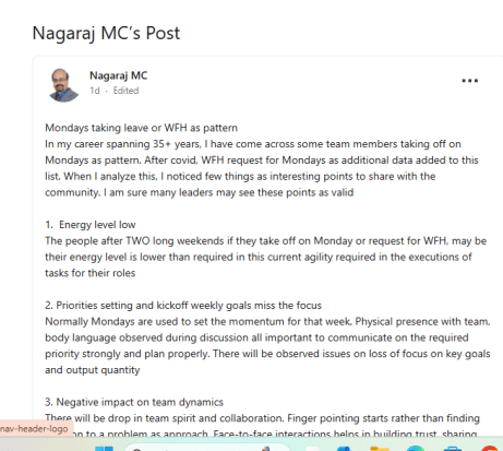 Nagaraj went on to argue that continuous absence on Mondays leads to poor team cohesion leading to blame-shifting, and reduced opportunities to build trust through in-person dialogue.