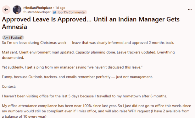 A Reddit post describing an Indian employee’s experience with sudden managerial pushback despite prior leave approval has struck a chord online, sparking debate around workplace culture, attendance policies, and managerial accountability.