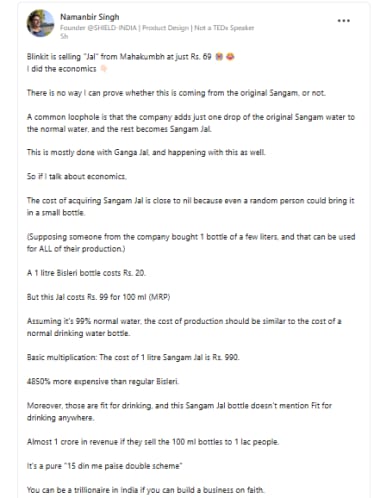 Singh’s post dissected the economics behind the product, suggesting that verifying the authenticity of the water is nearly impossible. “There is no way I can prove whether this is coming from the original Sangam, or not,” Singh wrote. He pointed out a common loophole in the industry—adding just a single drop of authentic Sangam water to regular water and branding the entire product as holy.