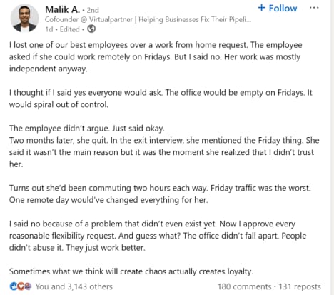 At a time when companies are talking about work-life balance and flexibility, a founder’s honest LinkedIn post has started a fresh debate. Malik A shared how he lost one of his best employees because he refused her request to work from home on Fridays.