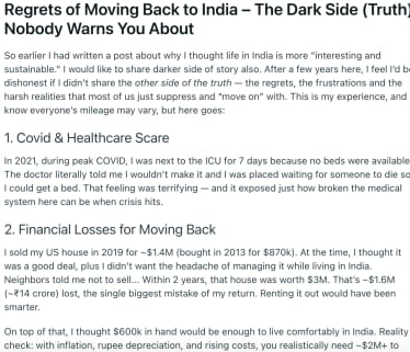 One of the most painful lessons, according to the techie came in the form of financial losses. The Redditor sold his US home in 2019 for $1.4 million, only to see its value soar to $3 million within two years. He estimated this decision cost him around Rs 14 crore. He further explained that the $600,000 he brought back was insufficient to sustain a “luxury” lifestyle in India, claiming that one would need at least $2 million to match the standard of living that many NRIs expect.