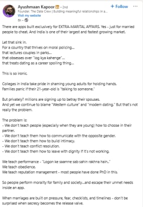 However, behind this image, dating platforms meant specifically for married people are growing in India, pointing to a change in how relationships are lived privately. The contrast between public morality and private choices has become a topic of debate, especially after a LinkedIn post by startup founder Ayushman Kapoor explained the trend.