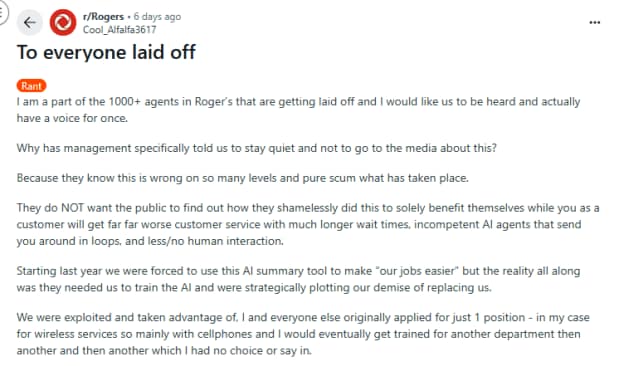 The user of Reddit addressed the post to “everyone laid off” under the subreddit thread r/Rogers. Claiming worsening conditions for customers as well, the redditor said that the AI agents who replaced the laid-off employees at Rogers were “incompetent AI agents that send you around in loops, and less/no human interaction.”