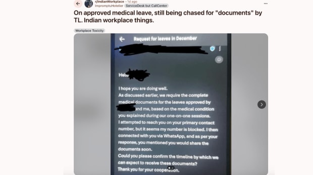 “On approved medical leave, still being chased for ‘documents’ by TL. Indian workplace things,” Reddit user, who goes by “ImpromptuHotelier” online, wrote in the title of his post. He also attached screenshots of the emails exchanged between him and his team lead to support his claims.