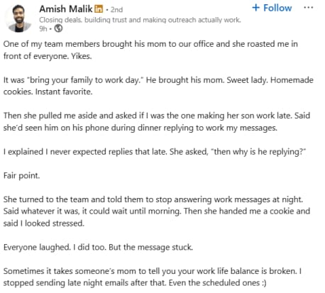 The experience made Malik rethink his own habits as a manager. He realised that even small actions from leaders can influence how employees manage their time. “Sometimes it takes someone’s mom to tell you your work life balance is broken,” he wrote.