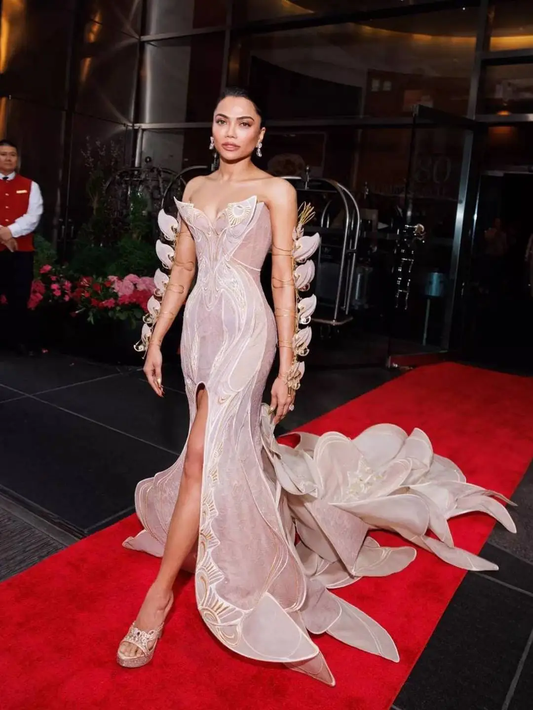 Patel’s ensemble, a sculpted nude gown by Iris Van Herpen, embodied the essence of the theme with its intricate butterfly-shaped corset and a train adorned with kinetic butterflies that gracefully fluttered as she moved.