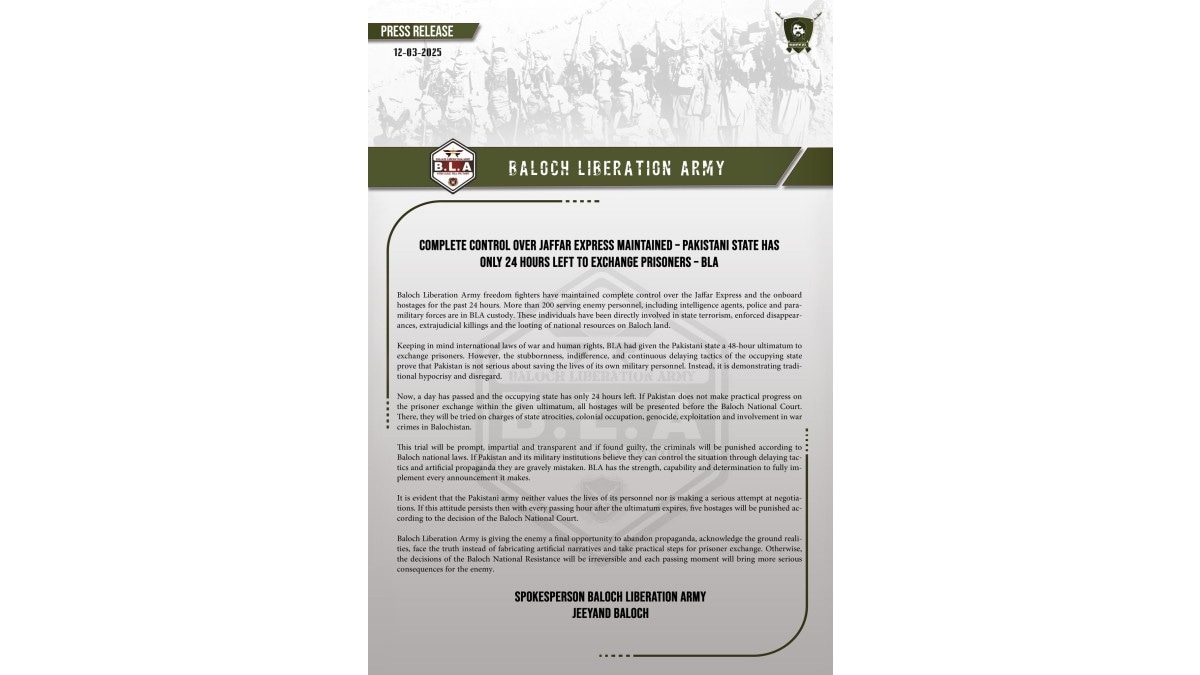 The Baloch Liberation Army (BLA) warns that if Pakistan does not make tangible progress on the prisoner exchange within the given ultimatum, all hostages will be presented before the Baloch National Court. The hostages will face charges of state atrocities, colonial occupation, genocide, exploitation, and involvement in war crimes committed in Balochistan.