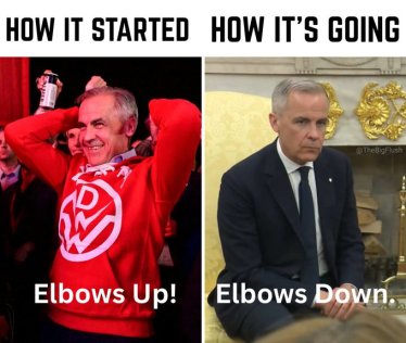 Memes also poured in, poking fun at Carney’s political balancing act, with one viral post reading, “So… elbows up or thumbs up?”