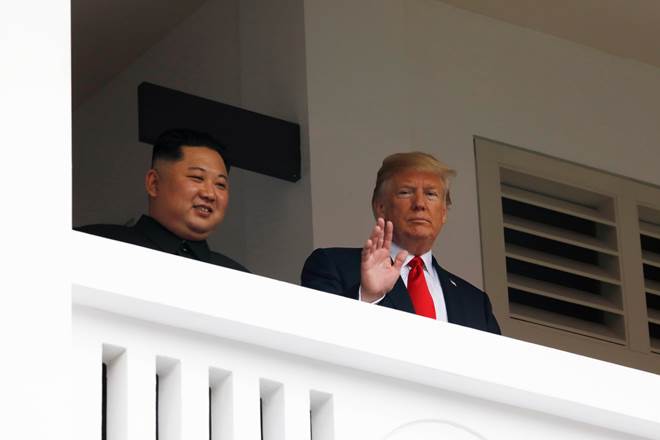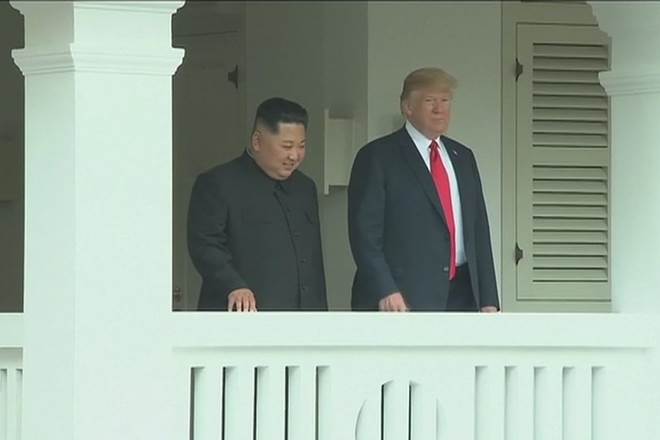 US President Donald Trump and North Korean leader Kim Jong Un walk together along balcony after one-on-one meeting.