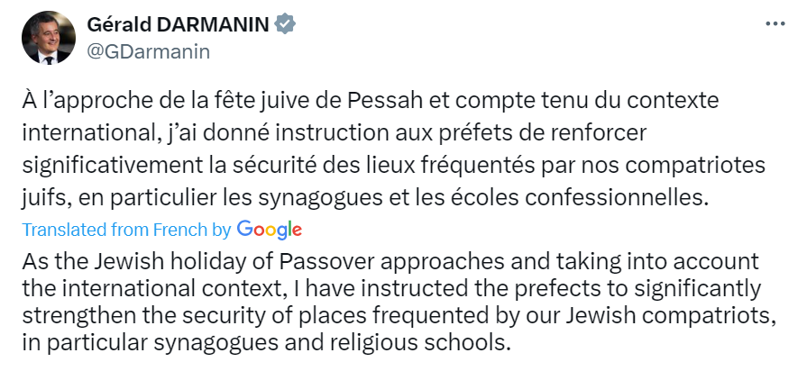 France will ramp up security around Jewish schools and synagogues, in response to the current Middle East crisis between Israel and Iran, said Interior Minister Gerald Darmanin on social media platform X.