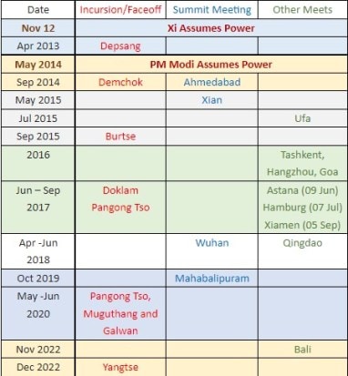 Xi Jinping has been an ideologically driven man ever since he assumed power in 2012. His mission is to build a modern socialist country, rejuvenate the nation on all fronts and realise the Chinese dream. He seeks to prove that the socialist system is the best form of governance compared to democracies. He has systematically eliminated all political opposition and ‘remantled’ a Maoist system of state control and command economy. He seeks to be the most consequential leader in Chinese history to the extent that he has got his own history pre-written. He seeks to make China The greatest power on earth and establish a Sino centric world order. To achieve this he must tackle two strong democratic powers consequential to China – USA and India. China must displace the USA as the pre-eminent power on earth and stymie India’s threatening rise. Displacing the USA is feasible only if China has sufficient comprehensive national power and a military at global scale. That has been a work in progress ever since he took over. Probably receding at this point of time. A rising India assumes importance due to many factors including the intractable border dispute. Stymying it by putting military pressure on the LAC has been Xi Jinping’s plan from the day he assumed power. Actually it is a well thought out plan which has been put into action. From all available reports, the number of transgressions across the LAC and border incidents have shown a significant uptick since Xi assumed power in 2012. There have been serious incursions and clashes between troops since 2012. This is despite the unprecedented number of summits and other meetings between Xi Jinping and PM Modi. In fact every major incursion/face off has been deliberately orchestrated around a summit or a visit. The table below clearly reflects that. Even the Depsang incursion of Apr 2013 preceded the visit of Li Keqiang in May that year. The recent Yangtse incident happened just after a month when Xi Jinping and PM Modi acknowledged the presence of each other at the Bali G20 meet. More importantly, Xi Jinping has spoken peace with India and has indulged in conflict with it. On the other hand he has implied conflict with Taiwan but has not made an overt military move except the hot air blown in the aftermath of the Nancy Pelosi visit. Very clearly, China under Xi talks one thing and does another. There appears to be an India fixation with Xi.As far as India is concerned he is proving to be the “Bad Emperor” in the Fukuyama mould.