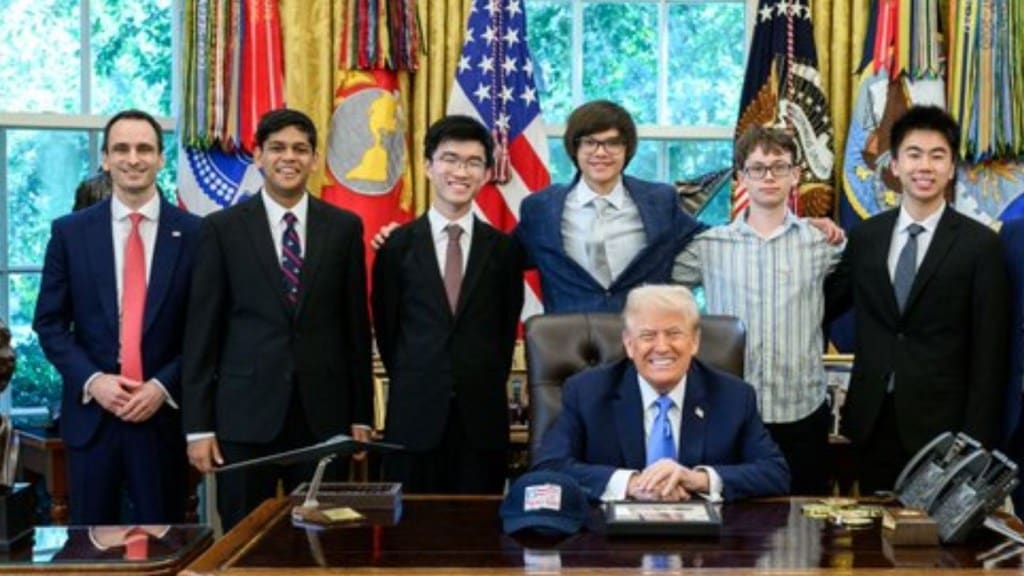 Trump’s aide Michael Kratsios shared an image of the President with the five-member team on X, writing: “Today POTUS & WHOSTP47 were proud to welcome the 2025 World Champion USA Physics Team to the White House! These incredible geniuses DOMINATED at the International Physics Olympiad in July, bringing home a record FIVE gold medals, the greatest performance in team history.”
