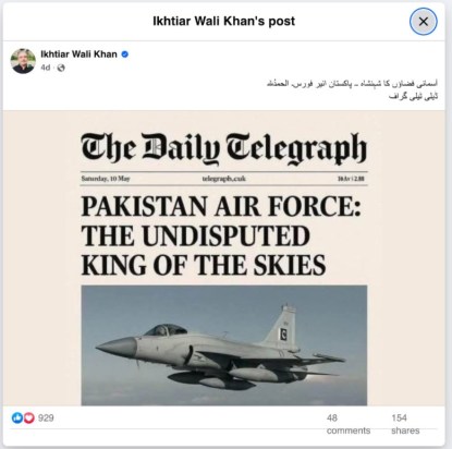 A widely circulated image claiming to show the UK-based The Daily Telegraph praising the Pakistan Air Force (PAF) as the “King of the Skies” amid the recent India-Pakistan military escalation has been proven to be fake. According to Dawn’s iVerify Pakistan, a fact-checking initiative, the image is not an authentic front page from the British newspaper and was generated using AI tools.