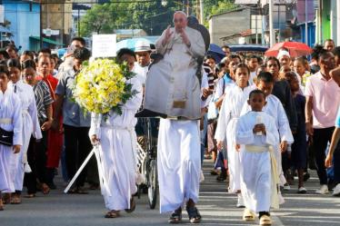 (Timorese Catholics carry a cut-out of Pope Francis during a procession ahead of a prayer service, following his death, in Dili, East Timor. Image: AP)