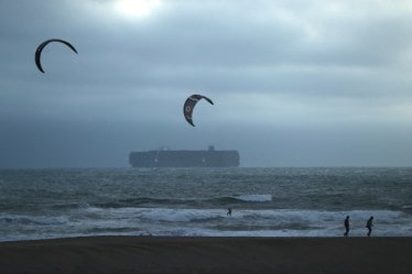 This picture below captures a pair of kite surfers near two beach walkers at Ocean Beach in San Francisco on Tuesday. (Image: AP)
