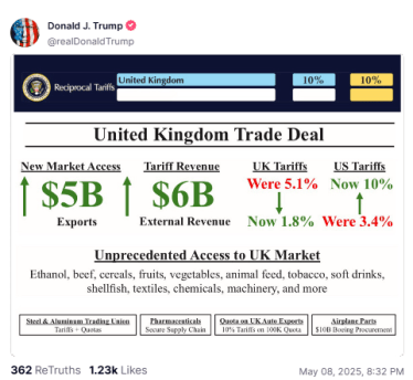 “Today is an incredible day for America as we deliver our first Fair, Open, and Reciprocal Trade Deal — Something our past Presidents never cared about. Together with our strong Ally, the United Kingdom, we have reached the first, historic Trade Deal since Liberation Day…This Deal shows that if you respect America, and bring serious proposals to the table, America is OPEN FOR BUSINESS. Many more to come — STAY TUNED!” the POTUS wrote on Truth Social.