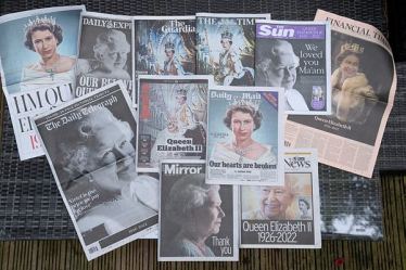 Newspapers devoted to the death of Queen Elizabeth II are seen in Manchester, England, Friday, Sept. 9, 2022. Queen Elizabeth II, Britain's longest-reigning monarch, died on Thursday Sept. 8 aged 96. (AP Photo/Jon Super)