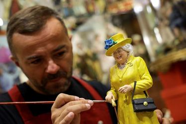 Genny Di Virgilio, craftsman of San Gregorio Armeno, Naples, Italy, works on a commemorative statuette for the death of Queen Elizabeth II, Friday, Sept. 9, 2022. (Alessandro Garofalo/LaPresse via AP)