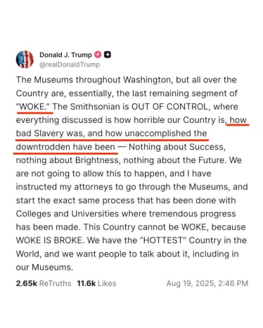 Trump’s Truth Social post complained about the repeated focus on “how bad slavery was.” He also revealed that he had instructed his legal team to go through the Museums and “start the exact same process that has been done with Colleges and Universities where tremendous progress has been made,” in his post.