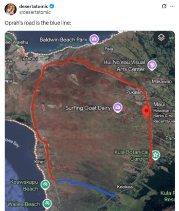A user even shared a satellite map of the region showing how Oprah’s allegedly private road, which is closed, is the shortest route from Kohei to Keokea, a safe zone. Others questioned why and how she can do that.
