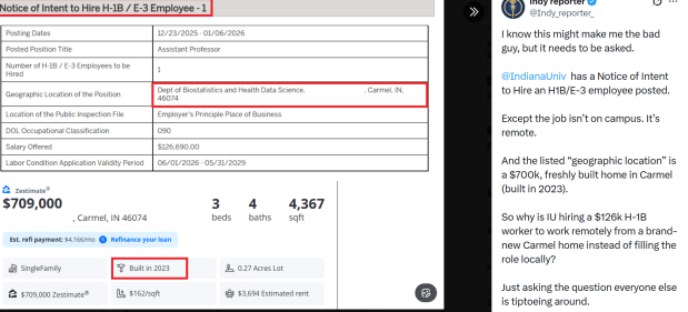 The social media post questioned why the university is pursuing a $126,000 H-1B-sponsored employee to work remotely from a newly built Carmel home, instead of filling the role locally or on campus. The original post has circulated widely, raising questions about H-1B remote work practices and compliance.