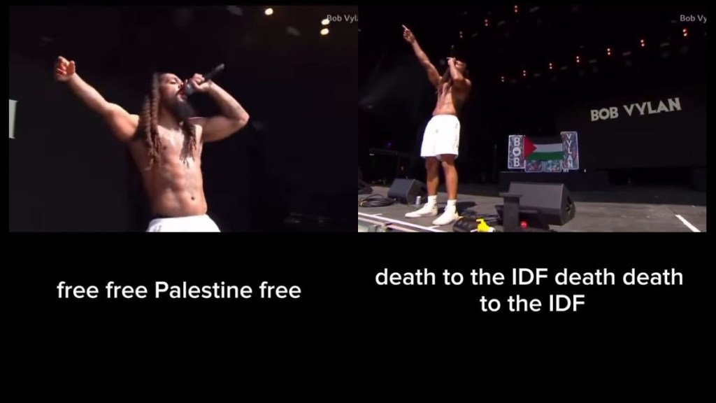 Over the weekend, Bob Vylan members performed at UK’s Glastonbury Festival’s third-biggest West Holts Stage. They eventually led pro-Palestinian and anti-Israel chants, prompting the massive crowd to join them in their outcry against the Israeli military. Videos circulating online have since shown the rappers shouting “Free, free Palestine,” and “Death, death to the IDF (Israel Defence Forces)” onstage.