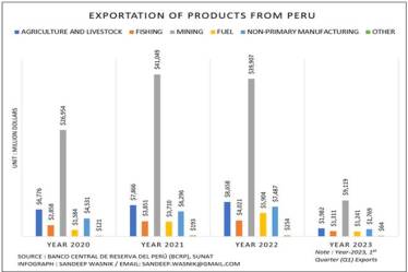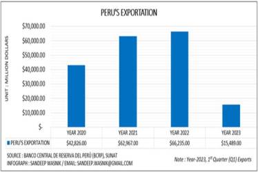 According to Banco Central de Reserva del Perú (Central Reserve Bank of Peru), Peru exported nearly US$66235 Million to the world in Year-2022, Year-2021 – US$62967 million, Year-2020 – US$42826 million. However, in “Year-2023” the exports recorded for the first quarter (Q1) is US$15489 million, as shown in an infographic.